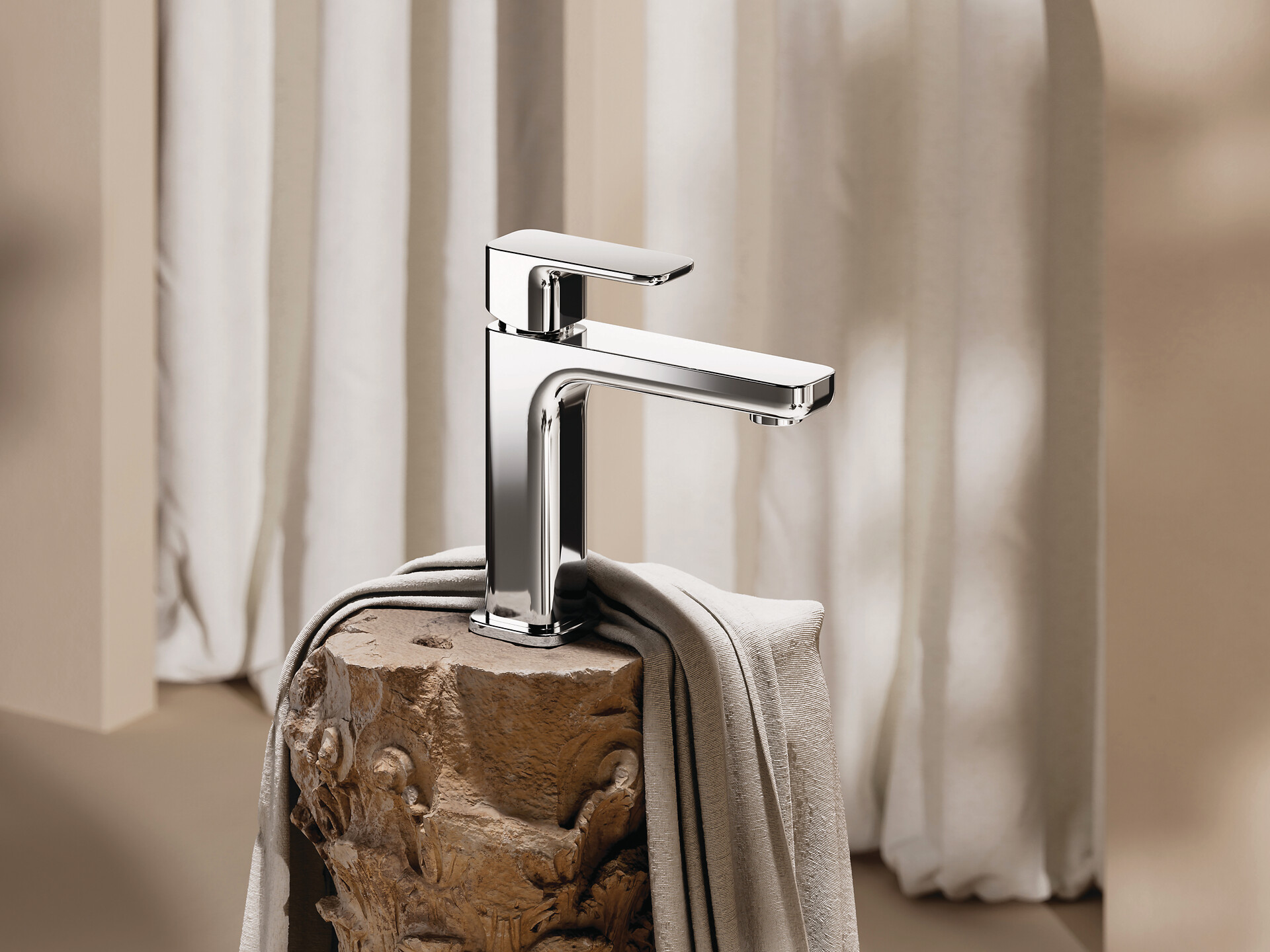 Das Design von KLUDI-RENON schafft eine Balance zwischen geometrischer Präzision und sanften Kurven und lädt zum Berühren und Entdecken ein.